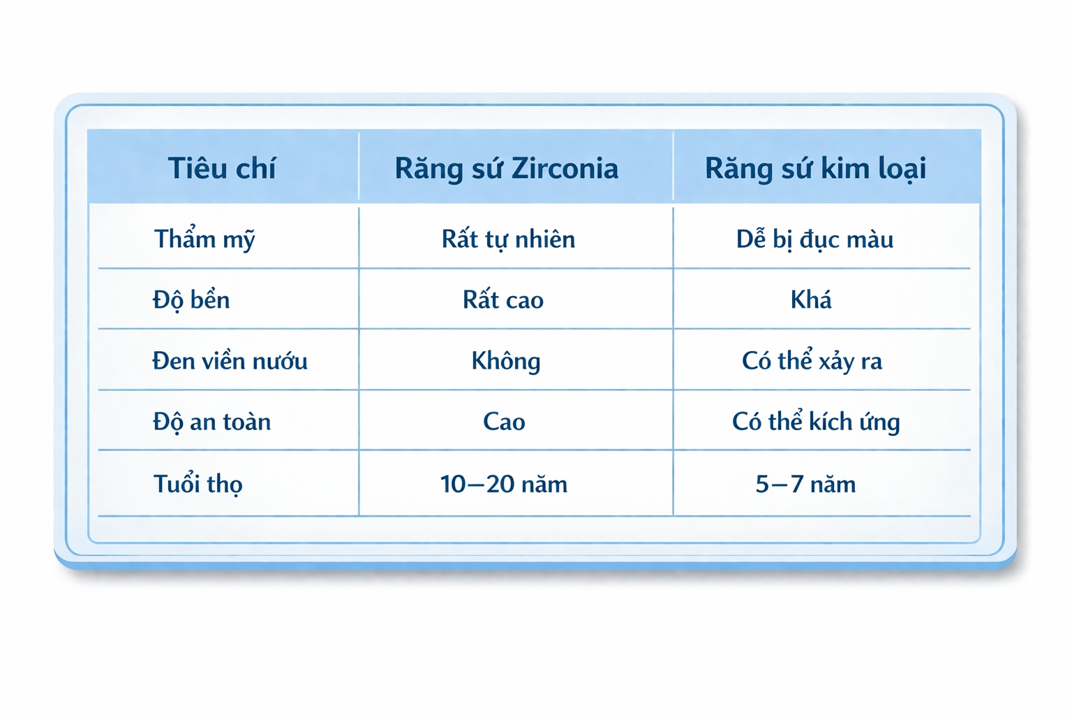 👉 Có thể thấy, Zirconia vượt trội hơn về lâu dài.